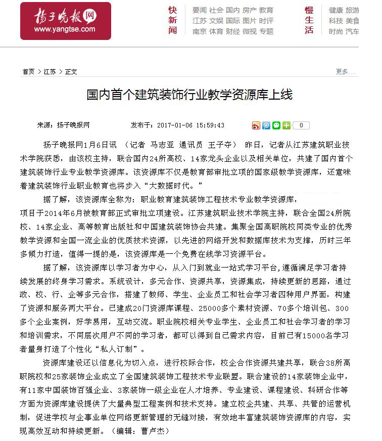 《中国建设报》、《扬子晚报》等多家媒体对国家级建筑装饰工程技术专业教学资源库进行了宣传报道推广