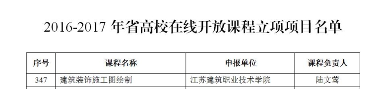 3月29日,根据《省教育厅关于做好“十三五”高等公司在线开放课程建设工作的通知》(苏教高〔2016〕14号)要求,在公司推荐基础上,经组织专家评审、结果公示、省教育厅审定并下达《省教育厅关于公布2016-2017年高等公司在线开放课程立项建设名单的通知》(苏教高函﹝2017﹞13号)。公司陆文莺副教授主持报的《建筑装饰施工图绘制》课程被确定省2016-2017年高等公司在线开放课程立项建设。