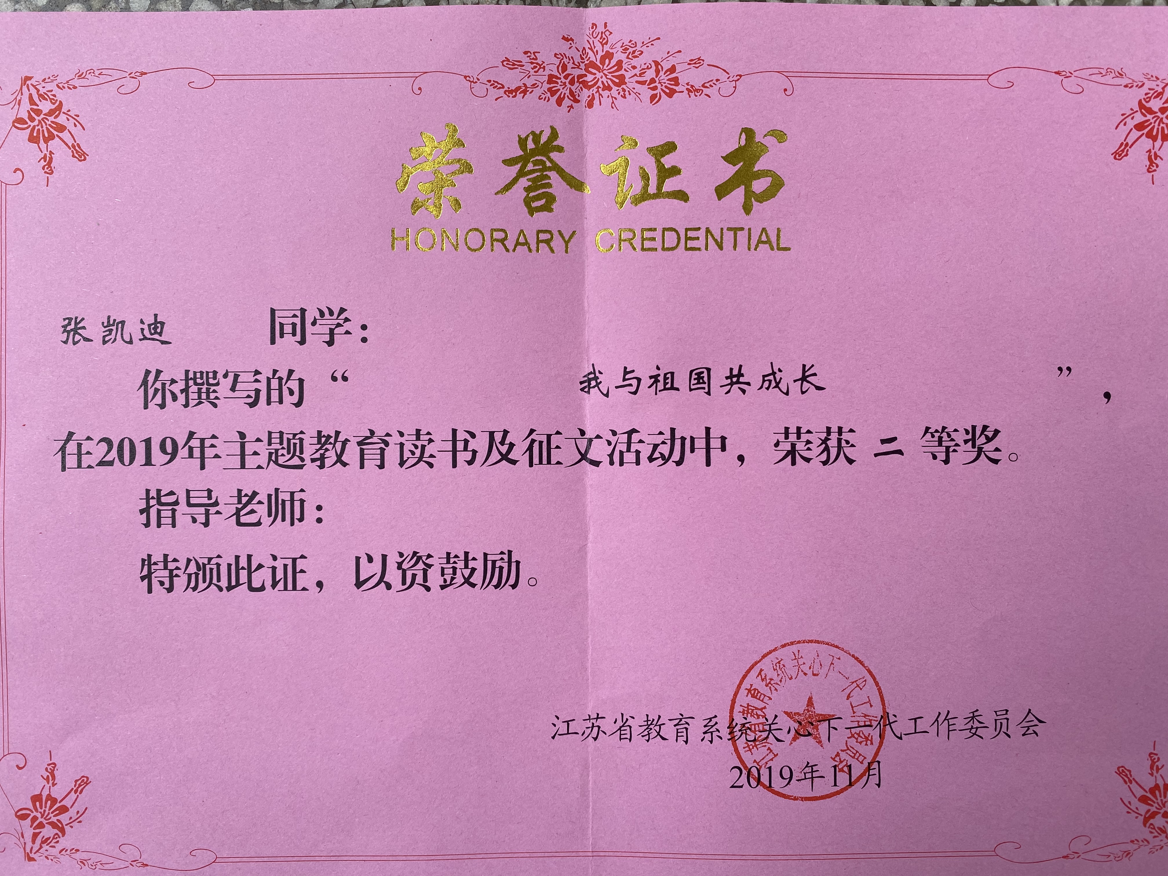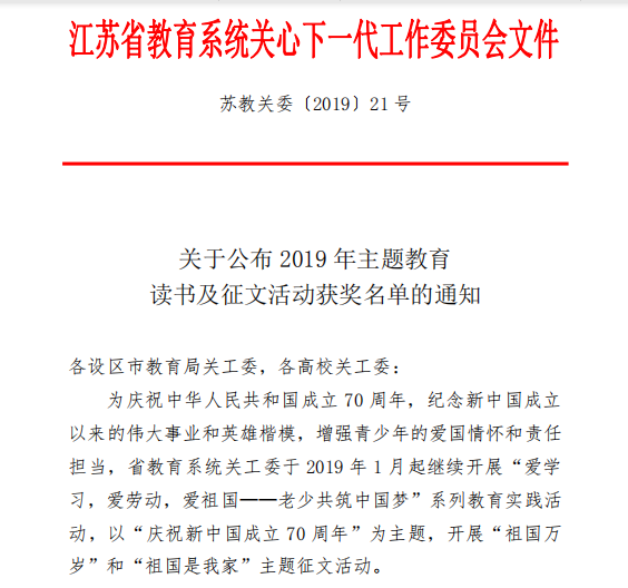 江苏省教育系统关心下一代工作委员会11月18日公布了2019年主题教育读书及征文活动获奖名单,公司室设17-2班张凯迪同学参评的《我与祖国共成长》一文荣获二等奖。张凯迪同学用自己的成长经历向祖国诉说,把故事与成长点滴交织在一起,谱写了深深的爱国情怀。