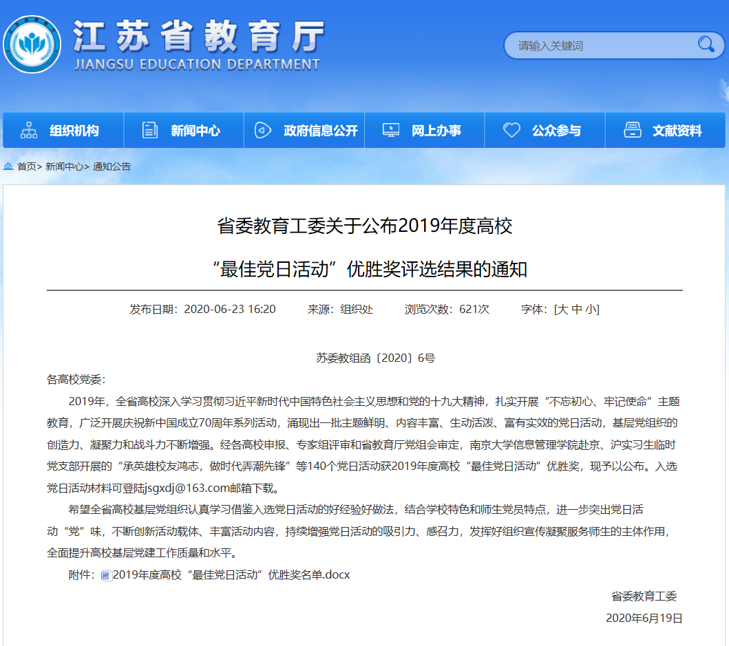 根据《江苏省委教育工委关于做好2019年度最佳党日活动申报工作的通知》(苏教委办〔2020〕7号),公司员工党支部申报的“‘发挥高职党员担当,助力农村精准扶贫’主题党日活动”荣获2019年度江苏省高校“最佳党日活动”优胜奖。