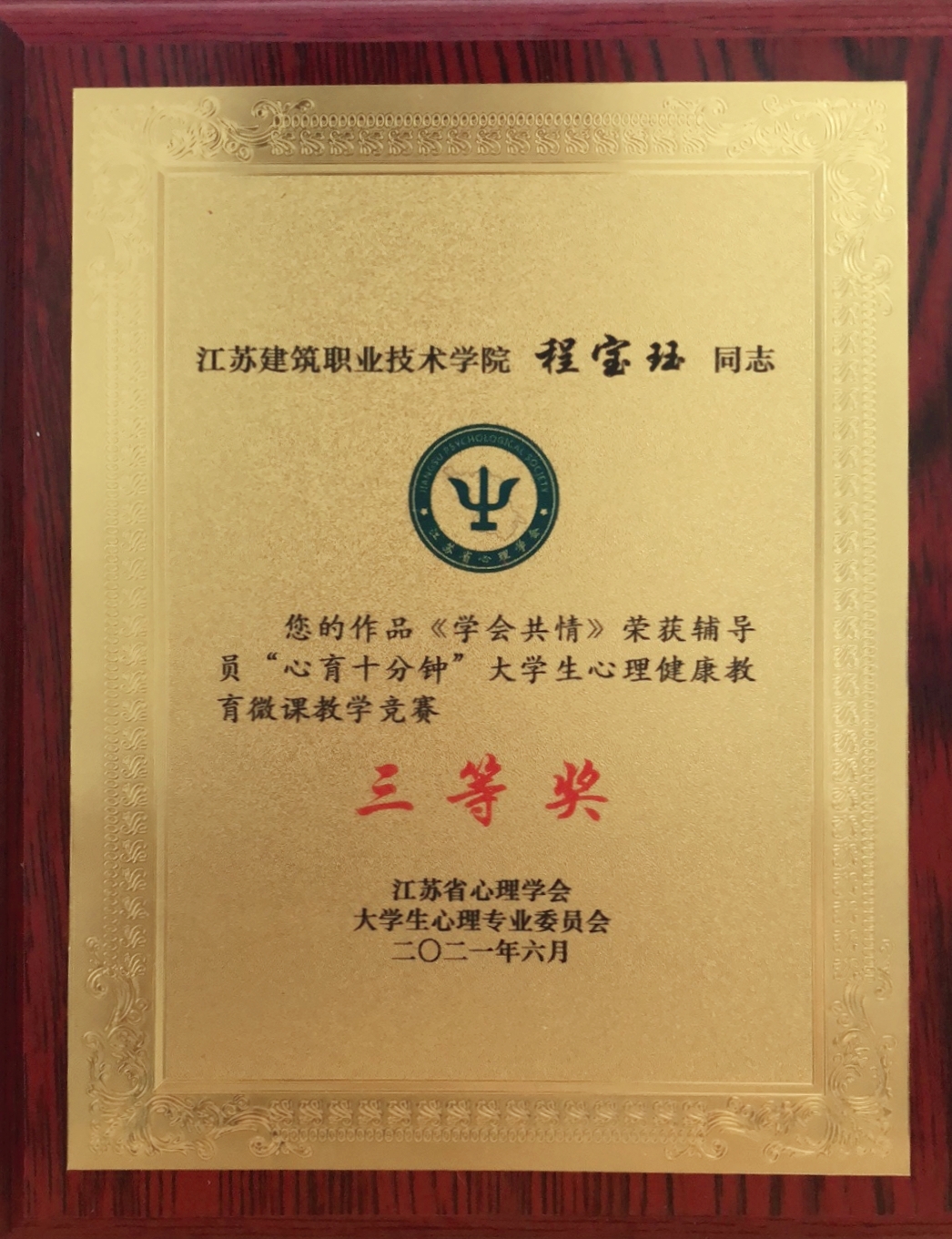 在刚刚结束的江苏省辅导员“心育十分钟”老员工心理健康教育微课教学竞赛中,公司专职辅导员程宝珏老师的作品《学会共情》荣获三等奖。