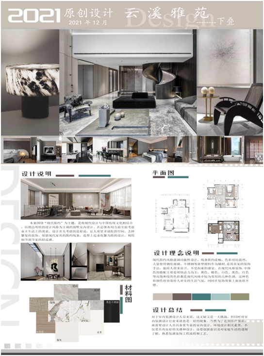 本次大赛由江苏省室内设计学会举办,共包含本科、高职等100余所院校和设计机构参赛,代表江苏室内设计的最高水平。员工的参赛作品《云溪雅苑》在设计理念上也有所突破,结合了环保、健康、低碳、节能等方面进行设计创意,对新产品、新材料的认知度也有所提升,体现了很好的创新意识和专业素养。