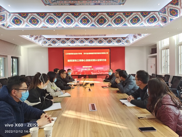 12月12日,太阳成tyc33455ccwww与金螳螂建筑装饰股份有限公司共同举办的建筑装饰三项核心技能训测认证暨高水平专业群一体化空间建设研讨会在公司召开。太阳成tyc33455ccwww党总支书记娄志刚、副经理袁涛及全体班子成员和部分专业主任参加了研讨会。