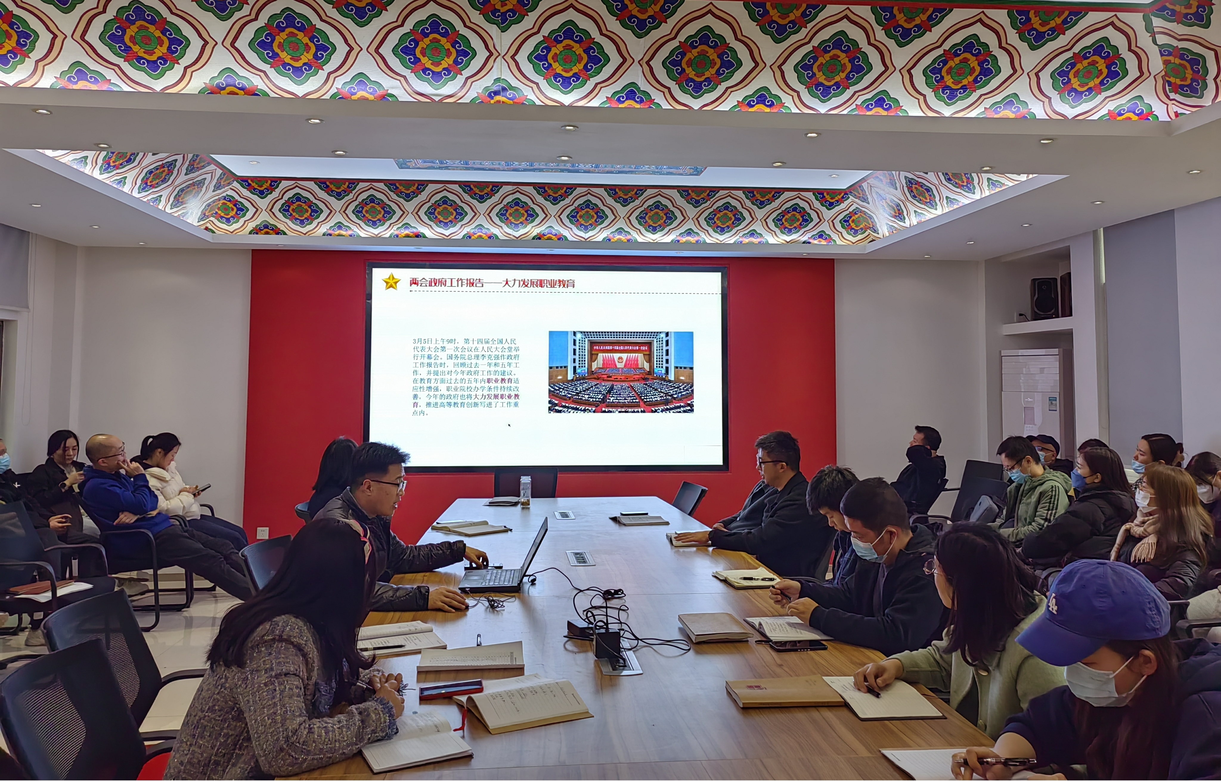 会议重点传达了“两会”期间习近平总书记重要讲话精神,政府工作报告的主要内容特别是关于教育的工作部署。今年的政府工作报告系统回顾总结了过去一年和五年我国经济社会发展取得的重大成就,提出了2023年工作总体要求、主要预期目标和八项重点工作,充分肯定过去一年和五年工作成效,并对今年工作提出了建议。同时,充分肯定过去的五年内职业教育适应性增强,职业院校办学条件持续改善。今年的政府也将大力发展职业教育,并将推进高等教育创新写进了工作重点。学习会上,娄志刚结合公司、教师、员工、专业发展等内容,深入浅出的阐明了“中国式现代化”、“稳中求进”、“新发展格局”、“供给侧结构性改革”等内涵,号召全体教职工以时不我待的精神状态砥砺奋进,增强政治能力,维护安全稳定,做到真抓实干,努力提高职业教育质量、适应性和吸引力,培养更多高素质技术技能人才。