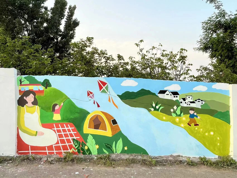 活动前期,员工党员在墙绘素材收集、墙绘主题选择、墙绘效果绘制等方面做了充足准备。绘制过程中,小组成员分工明确,经过打底稿、勾线笔描边、为图案配色上色,到最后的清洁工作都表现出了极大的耐心和认真。一面白墙,一支画笔,大家运用自己所学的专业知识和掌握的专业技能在墙面上设计作画,创作了多幅与“乡村振兴”“生态修复”相关的墙绘艺术作品。