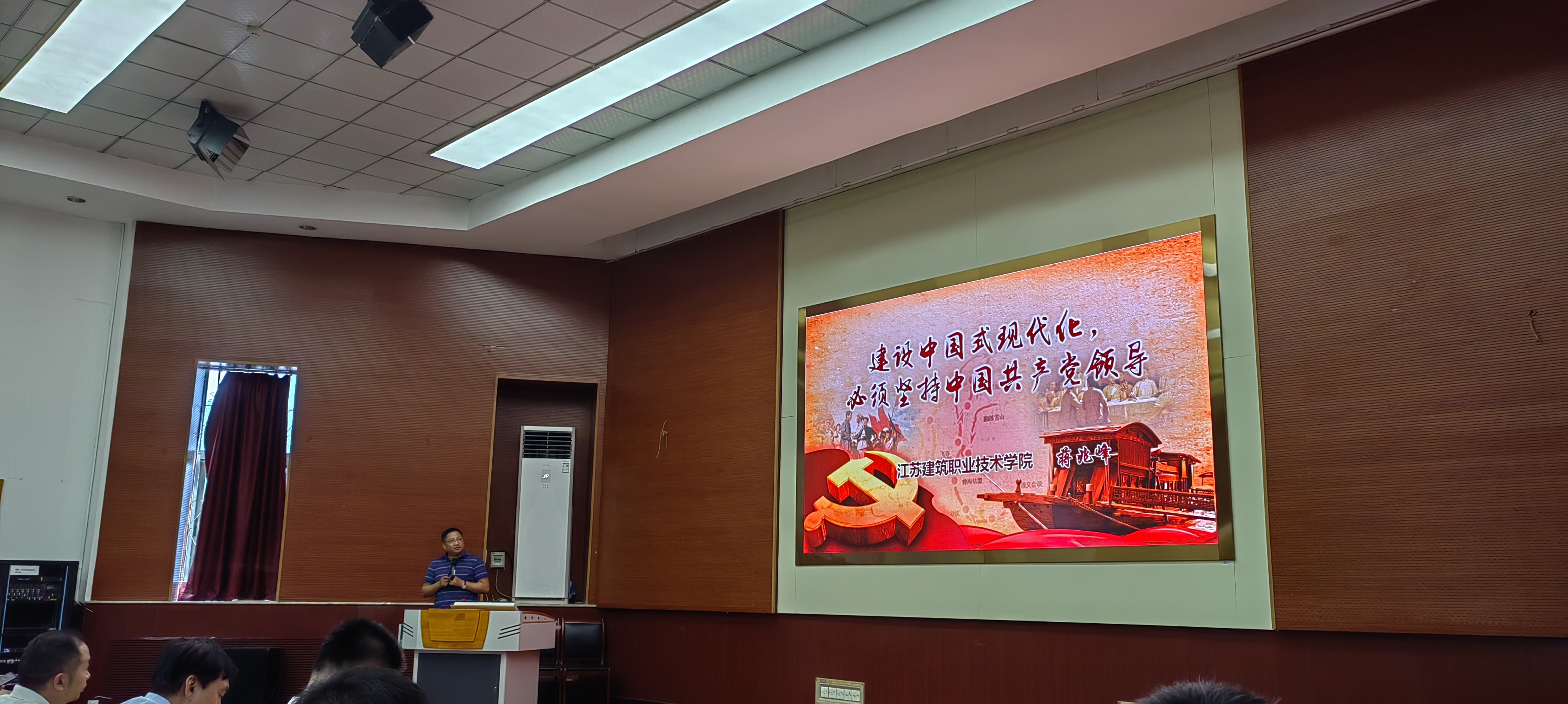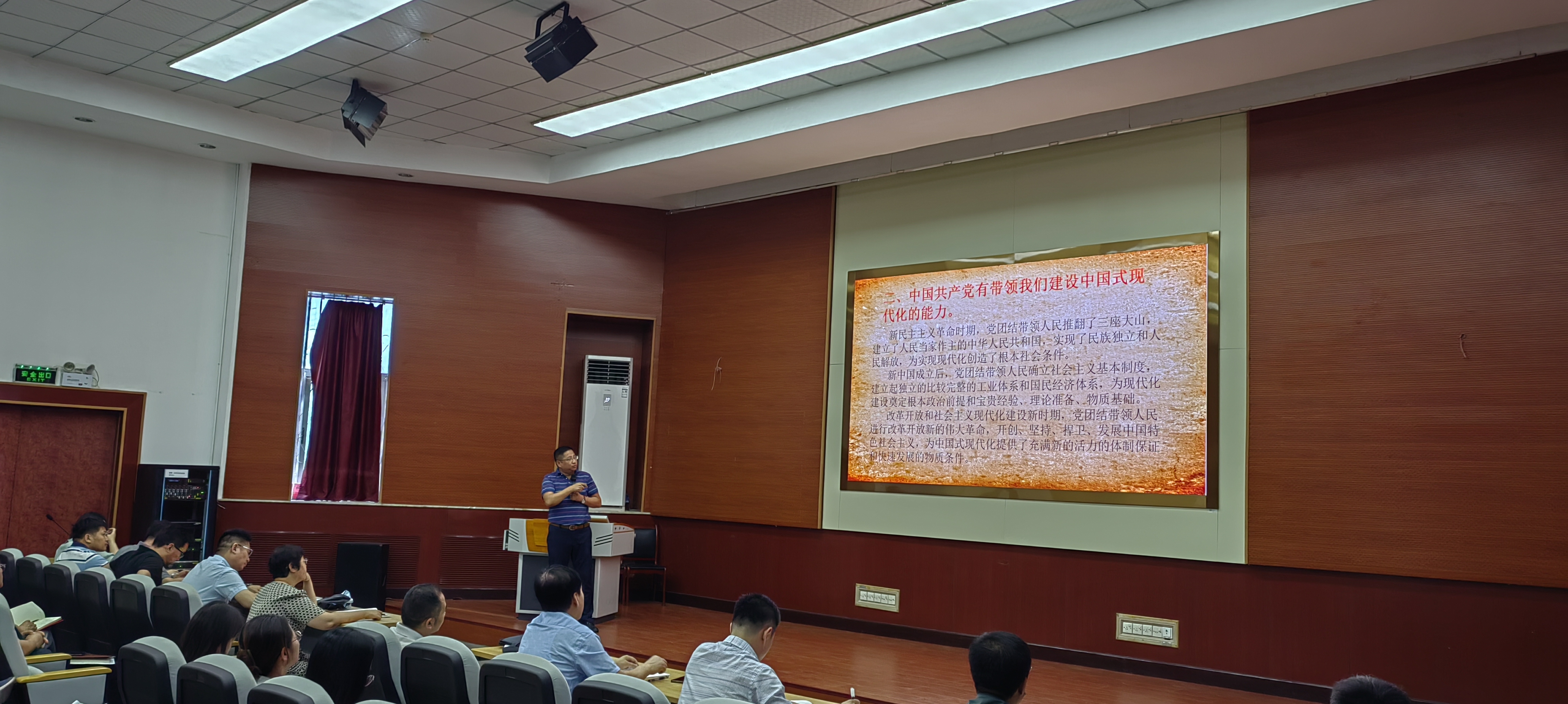 蒋兆峰以《建设中国式现代化,必须坚持中国共产党领导》为题,从中国式现代化,是中国共产党初心和使命的必然要求;中国共产党有带领我们建设中国式现代化的能力;中国共产党有带领我们建设中国式现代化的办法等三个方面进行了全面、系统、生动的阐述。