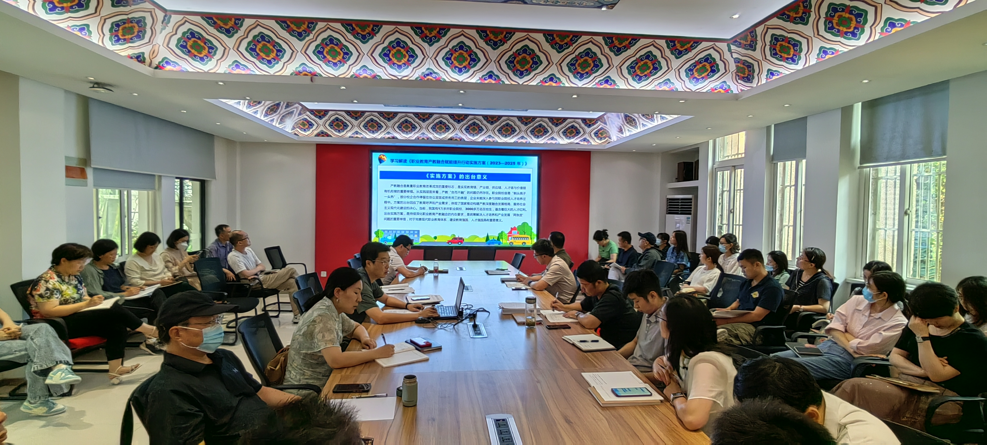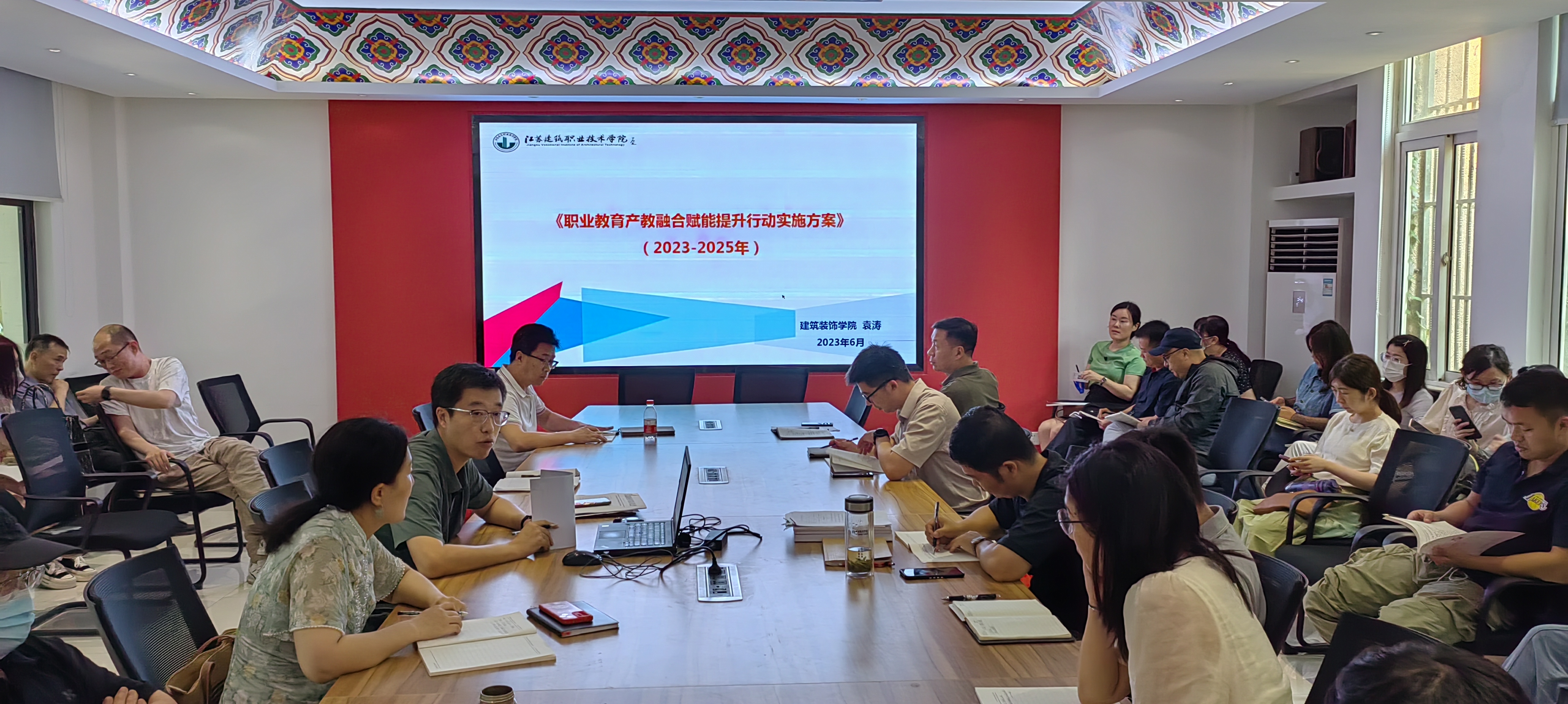 6月27日下午,太阳成tyc33455ccwww党总支开展主题为《职业教育产教融合赋能提升行动实施方案(2023-2035年)》的教职工政治理论学习,建筑装饰公司经理袁涛主讲,公司全体党员教师参加会议。