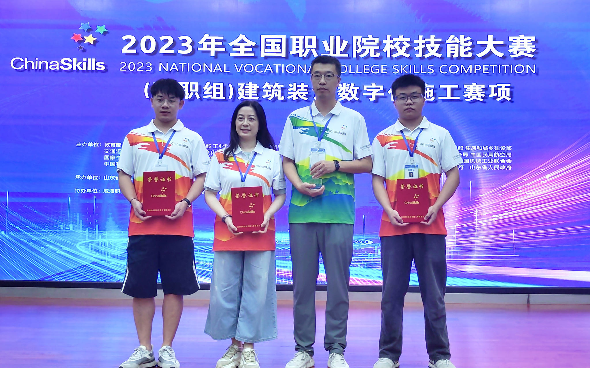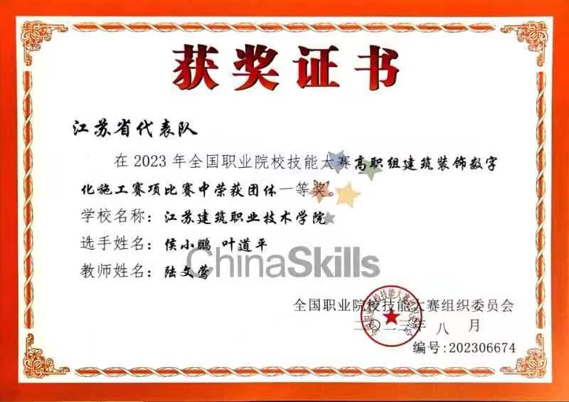 8月14日至17日,2023年全国职业院校技能大赛(高职组)建筑装饰数字化施工赛项在山东省威海职业公司举行。来自全国30个省、自治区、直辖市的59支代表队共计177名选手参加了大赛。公司由太阳成tyc33455ccwww陆文莺老师、装饰20-1班叶道平、室设20-1班侯小鹏组成的建筑装饰数字化施工赛项参赛队伍作为江苏省代表队之一,荣获本次国赛一等奖。