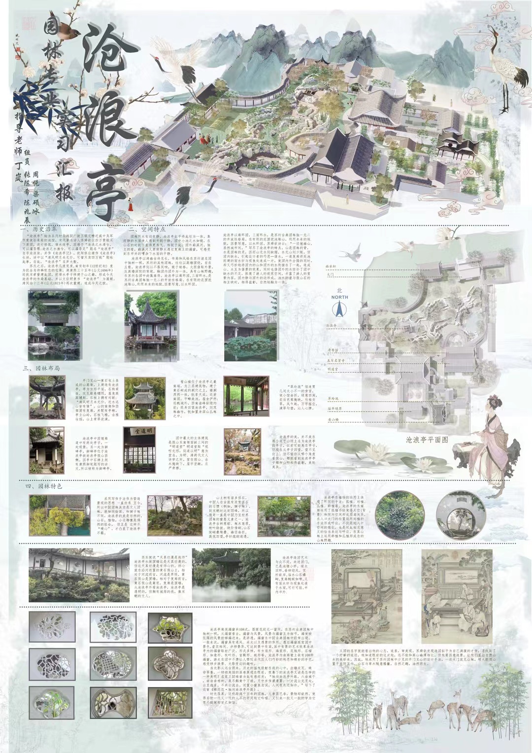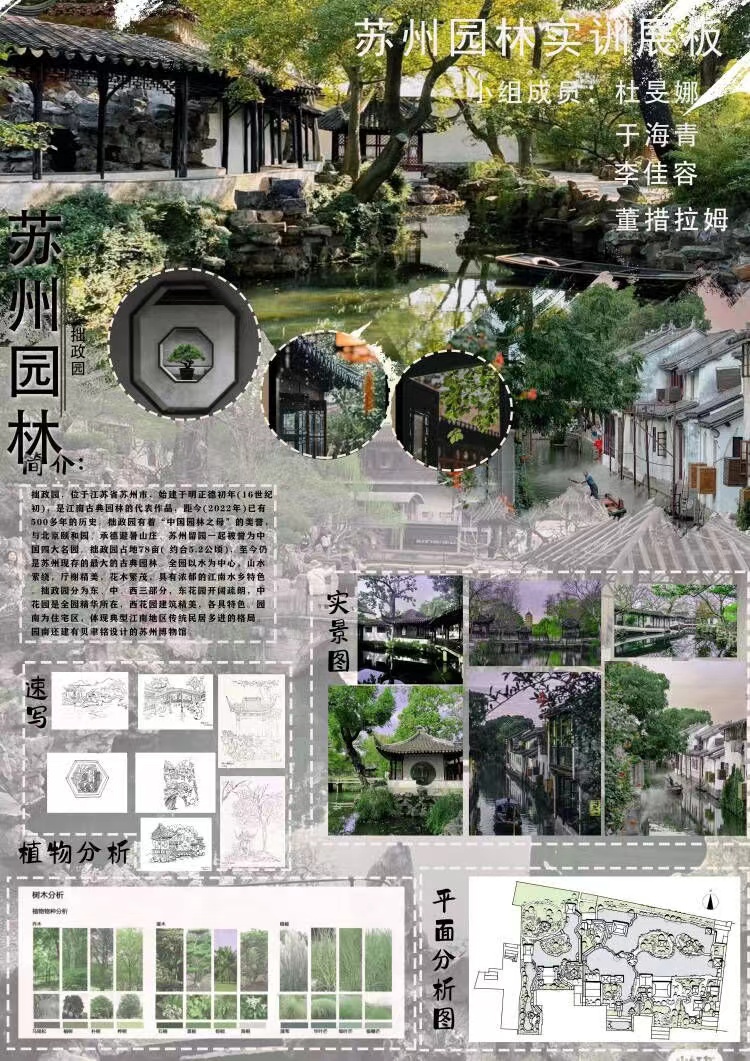 专业考察期间,同学们沉浸式地实地考察了拙政园、留园、网师园、沧浪亭等古典园林及金鸡湖滨水绿地的建筑、景观营造,植物识别及种植设计,同时,各小组对园林中的小空间进行了详细测绘,绘制完成了该空间的平面图,并在各园林中完成了摄影及速写任务。
