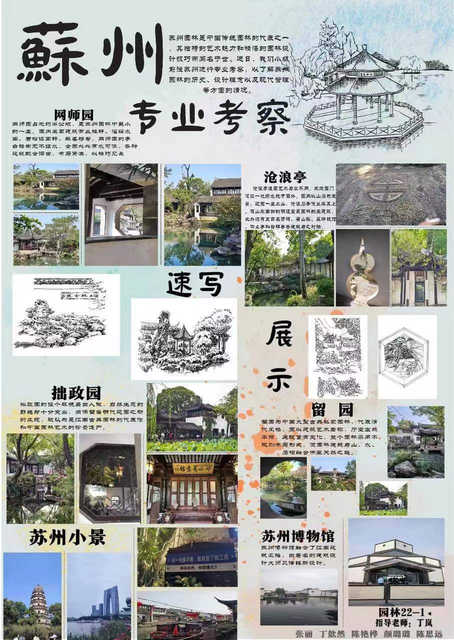 根据公司园林工程技术专业教学进度安排,2023年10月23日至10月28日,专业考察由丁岚、吴小青教师带队指导,园林工程技术专业2022级两个班五十余名同学赴苏州顺利完成了专业考察教学活动,并在太阳成tyc33455ccwww举办了专业考察课程成果汇报展。