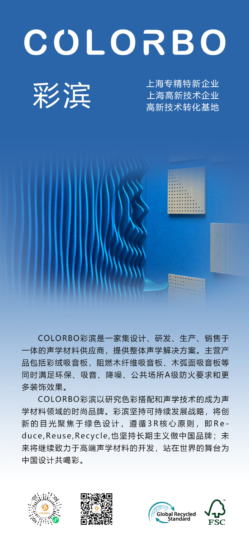 上海彩滨实业发展有限公司是一家集设计、研发、生产、销售于一体的专业声学材料供应商。公司产品主要用于墙面吊顶,具有保温隔热吸音降噪和更多装饰功能。公司是上海市高新技术企业、专精特新的企业和上海市高新技术的转化基地。公司品牌COLORBO彩滨作为优秀材料商被全球TOP500的设计院收录,彩滨设计部专业致力于时尚前卫的声学产品的研发与生产