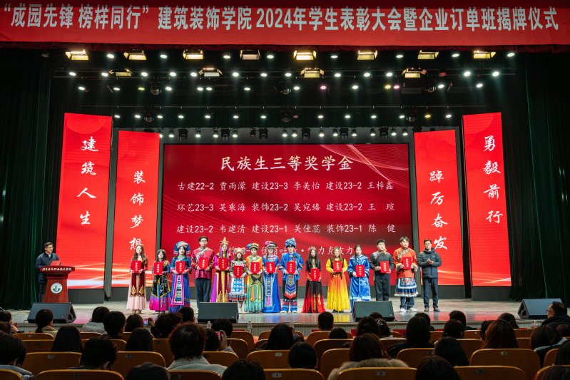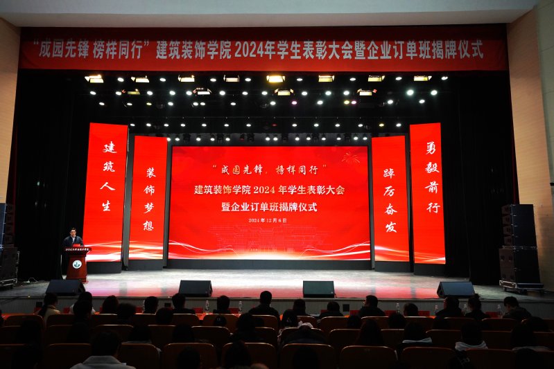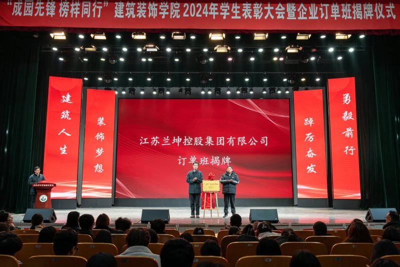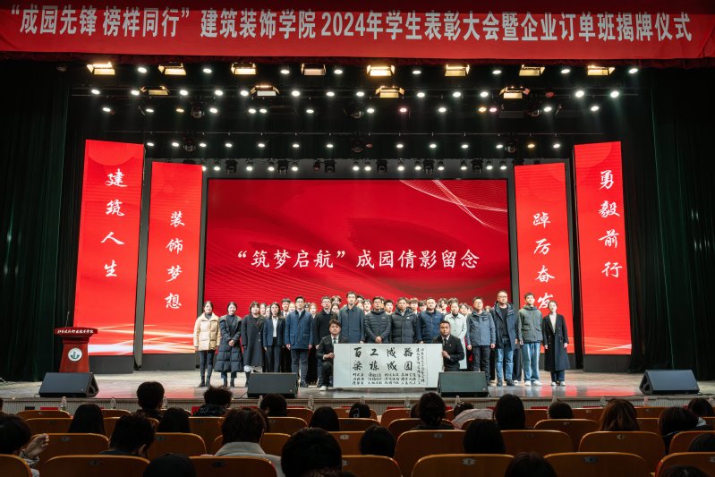 12月6日下午,太阳成tyc33455ccwww在会堂隆重举行2024年度员工表彰大会暨企业订单班揭牌仪式,对过去一年在学习、竞赛和各项工作中表现突出的优秀学子进行集体表彰,以表彰提升荣誉感、精气神、团结力,形成“激励先进、鞭策后进”的鲜明导向,同时表彰大会上师生欣喜迎来四类企业订单班的揭牌仪式。公司党总支书记娄志刚、经理袁涛、副经理王炼、翟胜增;深度合作企业江苏中核华兴装饰有限公司综合办公室主任宋佳女士,质量中心副总经理郭娟娟女士,江苏兰坤控股集团有限公司副总经理刘伟先生、马文超先生,集团鑫美公司副总经理刘金柱先生,江苏水立方建筑装饰设计院有限公司经理胡艳琴女士,天正建筑装饰江苏有限公司总经理朱攀登先生;公司全体专职辅导员以及2024级全体员工、全院受表彰的集体和个人,2023、2022级员工代表出席大会。大会由公司党总支副书记石峰主持。表彰大会共分为“学榜样行”——成园之星表彰、“听榜样说”——拔尖人才分享、“校企共建”——订单班揭牌仪式、“书记领航”——公司领导寄语、“传榜样力”——成园先锋传承、“筑梦启航”——成园倩影留念等六个篇章进行。